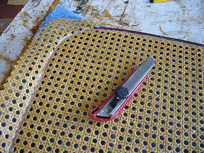 En la foto podemos ver lo que necesitamos para comenzar el trabajo: La plancha del ancho adecuado (vienen en diferentes medidas de ancho y también con dibujos más grandes) y el junquillo del calibre adecuado al surco de nuestro asiento (también hay de diferentes gruesos).