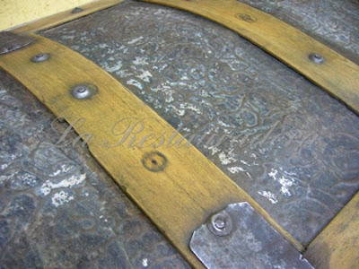 En las fotos no se aprecia lo bien que quedó el metal después de pintarlo y aplicar una pátina que resaltaba los relieves florales de la plancha de metal, localizados en el frente y en la tapa, y que combinaban con la tela de flores del interior… quedó la mar de coqueto!!!