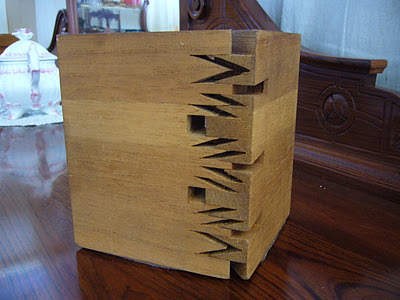 Pero lo más interesante de las cajas de cedro son sus ensambles de las esquinas frontales, generalmente primorosos y muy elaborados. En el caso de nuestra caja de cedro tiene ensambles denominados mayete cubano o diente de perro debido a su forma picuda, que pueden presentar en otros casos variaciones en el número de dientes. El resto de los ensambles que unen los laterales de la caja suelen ser de «cola de milano».