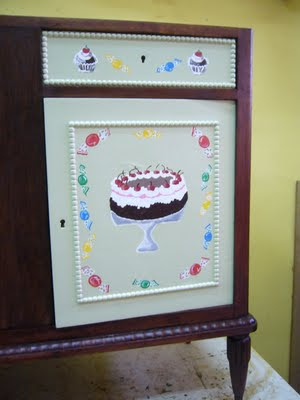 Si tuviera una pastelería, pondría todo el mobiliario así; La imagino llena de muebles decorados con los dulces, las bandejas altas con sus tartas y recipientes de cristal llenos de caramelos. Todos obligados a entrar