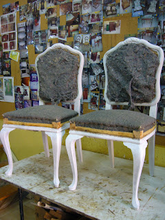 No tengo todavía las fotos de como llegaron las sillas al taller… Estaban barnizadas y desencoladas así que como la idea era pintarlas con un efecto decapé, comenzamos a trabajar quitando el tapizado viejo y lijando el barniz.