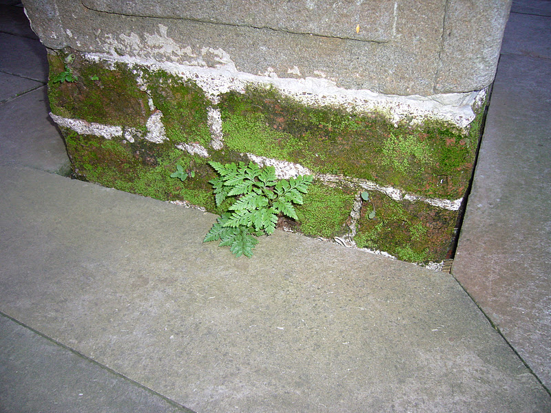 Después de visitar el la Iglesia del Convento de las Catalinas, con unos retablos preciosos que aún no han sido restaurados y, por lo tanto, llenitos de deterioros de varios tipos (suciedad, insectos xilófagos,…), nos dirigimos al Ayuntamiento y a la sede del Cicop, donde encontramos en su patio varios ejemplos de liquenes, musgos y plantas inferiores (verodes y helechos) en las piedras que forman el basamento de las columnas.