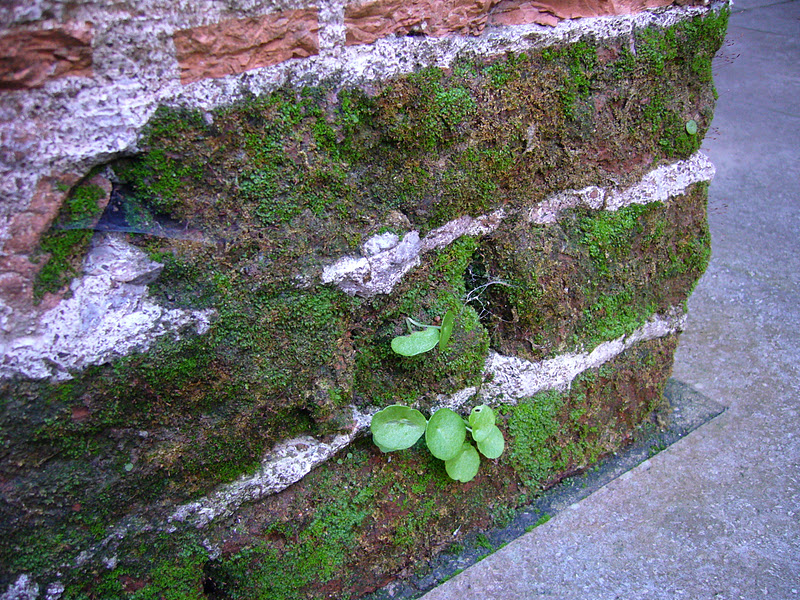 Ya estaba cayendo la tarde y refrescando, que el problema de La laguna es la humedad que nos cala los huesos…llegamos al Instituto Cabrera Pinto y nos encontramos cantidad de líquenes (amarillo), musgo, hongos (manchas negras) y hasta algas en las piedras de la entrada.