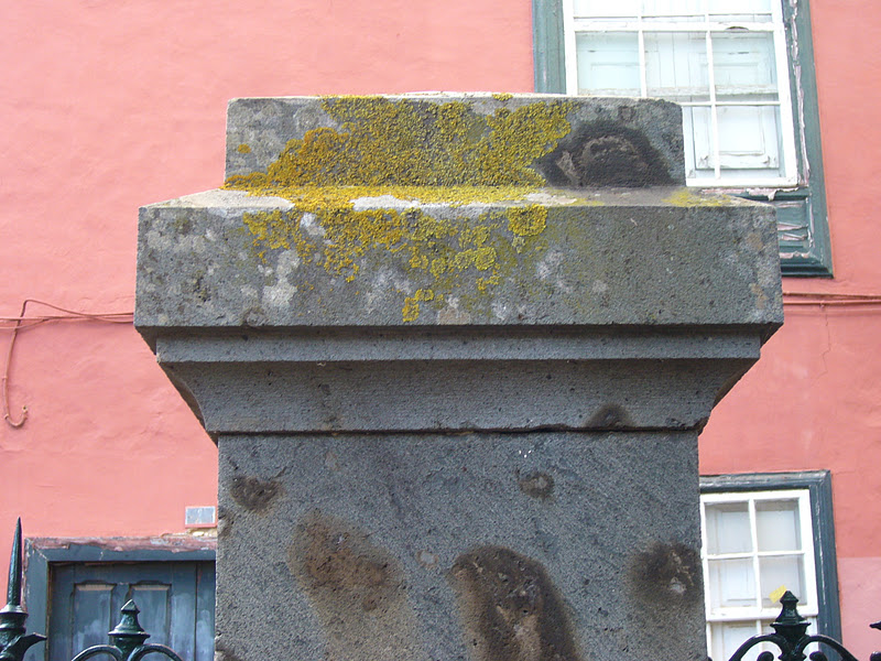 Ya estaba cayendo la tarde y refrescando, que el problema de La laguna es la humedad que nos cala los huesos…llegamos al Instituto Cabrera Pinto y nos encontramos cantidad de líquenes (amarillo), musgo, hongos (manchas negras) y hasta algas en las piedras de la entrada.