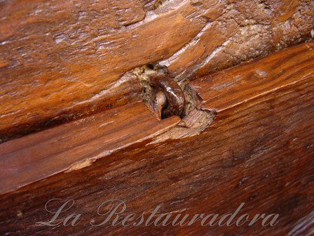 Así que nos pusimos manos a la obra… Lo primero fue decapar el barniz y dejar la madera limpia de manchas y suciedad. Encolamos, empastamos y lijamos (no mucho, lo justito…), le aplicamos un tinte al agua ligero para igualar y unas cuantas manos de goma laca para fijar el tinte y cerrar el poro. Finalmente acabamos con cera… después de frotar y frotar (no demasiado, la tea es muy agradecida), conseguimos el resultado que vieron al inicio de este artículo.