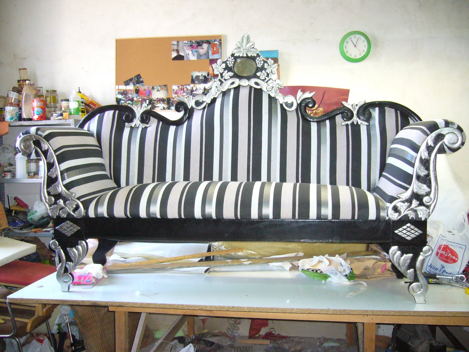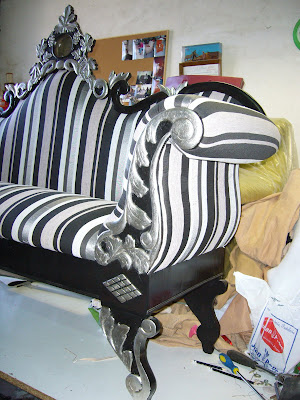 Tras decaparlo y desmontar el tapizado para dejarlo en la estructura, lo teñimos de negro y barnizamos, y le aplicamos pan de plata en algunos detalles de la talla para resaltarla.
