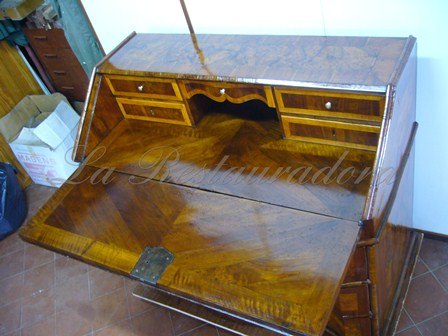 Continuamos con el proceso de restauración del buró…Hablamos del valor de la pátina de este mueble dada su antigüedad, además del deseo del cliente de que se apreciara su uso y su historia vivida. La propuesta de restauración contemplaba la menor intervención posible con una limpieza general que no dañase la pátina del tiempo (grietas, marcas, alabeados, etc…) pero que recuperase la belleza de la madera de nogal. Todo ello había que combinarlo con un tratamiento curativo contra la carcoma y una cierta consolidación estructural, así como la reposición y reintegración de las chapas faltantes.