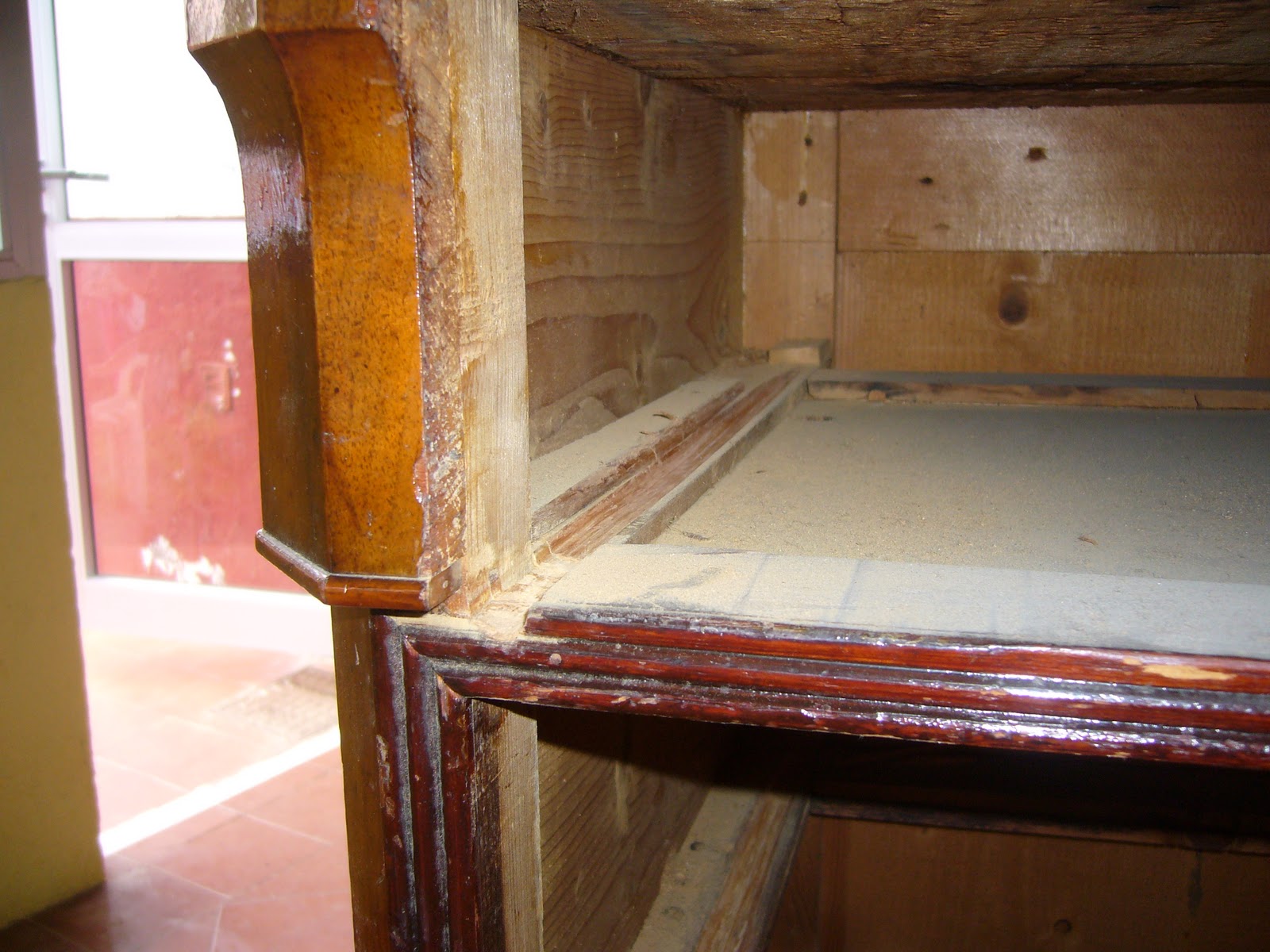 Después de realizar trabajos de carpinteria saneando guías y talones, consolidando la estructura y reponiendo las partes deterioradas por la carcoma, retiramos todo el barniz envejecido para así poder realizar el tratamiento contra la carcoma.